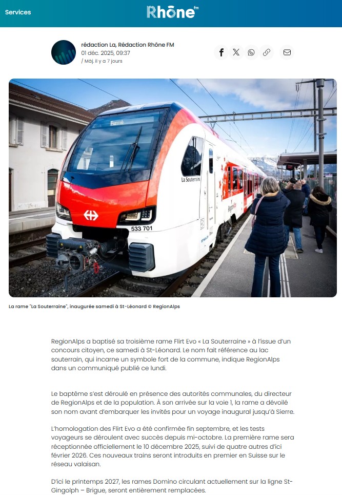 29 novembre 2025 - Baptême de la troisième rame Flirt Evo à St-Léonard, en présence de la population.